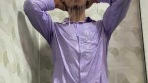 Scene: Elegantly Dressed Shower with Wet White Briefs at the End