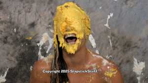A pure, iconic pied face for the ages! I think this may well be the first pie ever taken by a SlapstickStuff model -- I'm almost certain it's the first pie scene Rich ever shot (at least for public consumption with a paid model), although the model may have been hit with the first two pies at the point this pic was taken, not sure.
