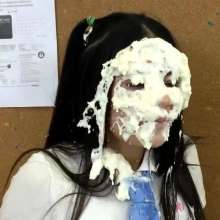 I have no idea where this is from but she pies herself like a real pro. Smash... up and over the top, and then she revels in the mess.