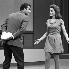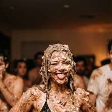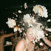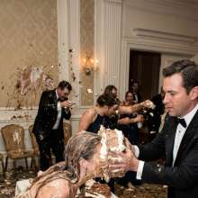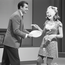 I assume this was inspired by the episode of "The Price is Right" where the the hostesses pied each other, then the announcer, then teamed up on Drew, and then the announcer got the winning contestant. (I love that part.)