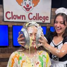 This pie must have had slow-motion cream, as somehow the blonde got out of the way of the splatter.