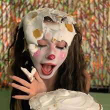 "Oh no! That third pie coming straight for my face is twice as big and three times as gloopy as the two I'm holding."