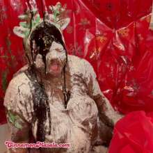 with 5 sacks of flour, 4 pots of choc., three quarts of goo, two cans of cream and some pinkish slop on my red nose