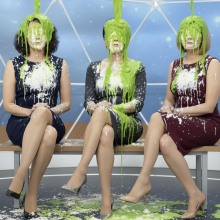 Don't think I've ever seen an angora sweater dress in the wild -- or even dreamed such a thing existed -- but now I'm not going to be able to stop thinking about it! One of the perfect outfits to be pied in!