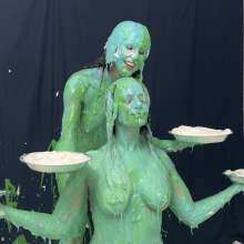It's grueling work, but those pies ain't gonna shove themselves in pretty faces! SOMEONE's gotta put in the work, and it might as well be yet more sexy woman who have already been slimed and pied themselves . . .