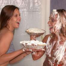 Two beautiful babes whose charms are bodaciously displayed in bikinis, each holding two pies and wearing a third pie all over her lovely face what could possibly be better?!?