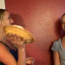 Mackenzie looks stoic as she braces to catch her first pie of the day with her pretty face!