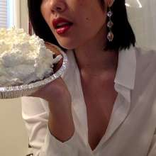 I love the way she is looking at that pie, slightly biting her lower lip, and half-smiling. You can tell she's not entirely dreading the prospect of having that creamy dreamy confection shoved in her face!