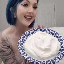 Someone's feeling a little sassy with a big creamy pie in hand . . .
