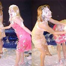 Love the beautiful smile and taunting expression on the pie thrower's face... also her legs look amazing! As for our poor victim, she has great boobs and great helpless hands... not to mention a sloppy faceful of dreamy cream pie!