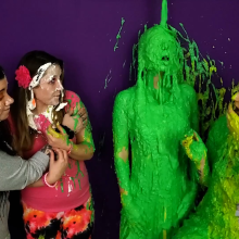 The shocked reactions from the three onlookers are perfect! And of course Melody looks amazing under that bright green slime deluge!