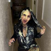 Don't think I've ever seen an angora sweater dress in the wild -- or even dreamed such a thing existed -- but now I'm not going to be able to stop thinking about it! One of the perfect outfits to be pied in!