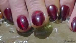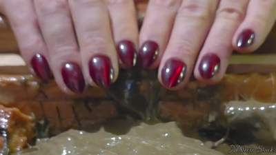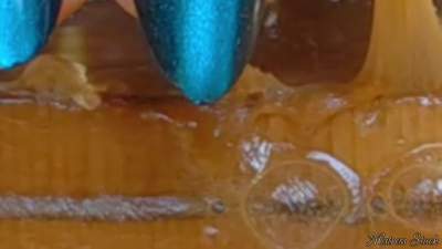 Mistress takes on a batch of sticky glue with her pearlescent blue nails at her finger tips. She plays with the surroundings and tantalizes your senses with tapping and scratching sounds, before taking her fateful plunge into the ooze.