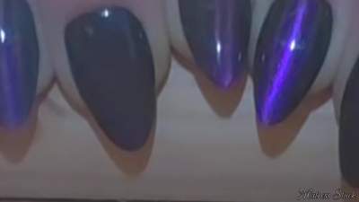 Luminescent nails, lavish and purple, adorn Mistress Stuck hands in this scene. They sparkle amid the lights from above and shows how she likes to play and tease herself, dancing her nails before fate's sticky grasp below. Mistress wanted to feel ext...