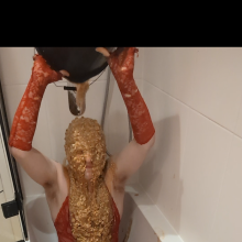 Commented on the video Gunged in Thick Yellow Gunge, "Wow, love that red suit, goes so well with the yellow gunge!"
