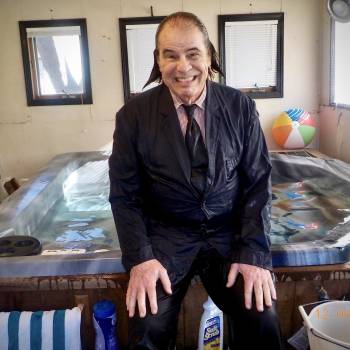 Doug singing while swimming fully-dressed at Bloomington East Beach, Clinton Lake, Kansas, Summer 2021.