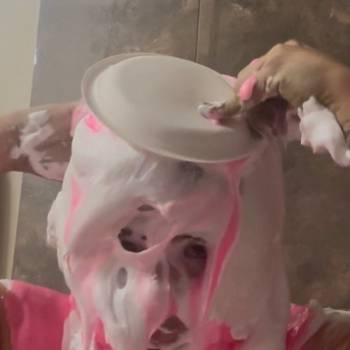Me shirtless pouring chocolate and maple syrup all over my head in a bathroom, and loving every second.