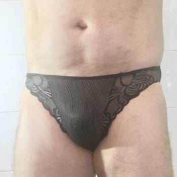 I take a shower in a woman's swimsuit. I stand under the spray and get the swimwear completely wet front and back.